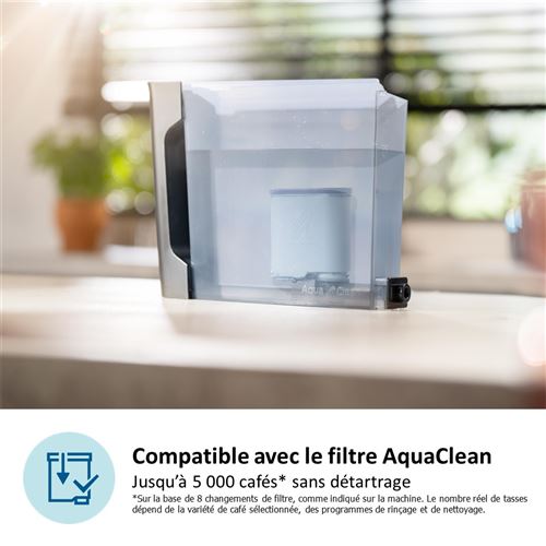 - L’eau de votre café doit être filtrée pour éviter l’accumulation de calcaire comme la dureté de l’eau. Cet expresso broyeur est compatible avec les cartouches AquaClean : elles permettent une eau purifiée jusqu’à 5000 tasses avant un détartrage