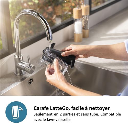 - Le nettoyage du système lait : Pour éviter la prolifération des bactéries du lait, il faut bien entendu rincer votre carafe LatteGo. Mais rassurez-vous, il n’y a pas plus simple, la carafe se rince sous l’eau du robinet en quelques secondes seulement. Vous pouvez-même la passer au lave-vaisselle directement.