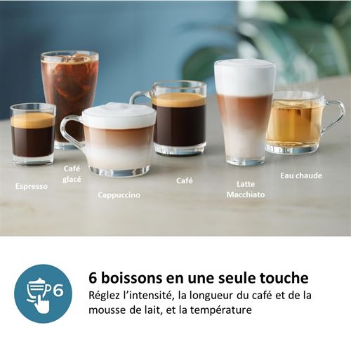 Sur cette machine expresso broyeur, vous pourrez réaliser plusieurs boissons: des boissons cafés classiques (expresso, café noir), lactées (cappuccino, macchiato), et aussi des boissons froides (café glacé). De plus, la machine est équipée de la technologie Silent Brew qui réalisera toutes les extractions avec moins de bruit.