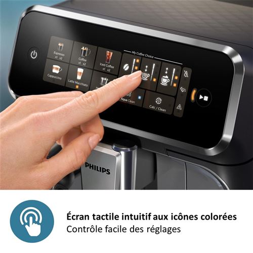La finesse de votre café sera réglable sur 12 niveaux de moutures différentes. Vous aurez également le choix de l’intensité et la longueur de tasse sur 3 niveaux pour toutes les boissons café. Ces paramètres sont très simples à sélectionner depuis le grand pavé de réglages de la machine EP3349/70 : ses touches sont tactiles et intuitives avec des pictogrammes. Il y a par ailleurs des petites diodes qui clignotent sur ce pavé tactile, pour attirer l’attention de l’utilisateur : lorsqu’il n’y a plus d’eau par exemple.